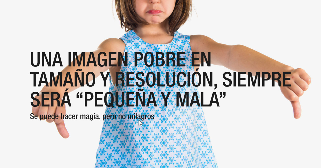 La madre de todos los corderos es el tamaño y la resolución. Aquí el tamaño no solo importa sino que es crucial. Una imagen pobre en tamaño y resolución nunca podrá aspirar a hacerse grande sanamente. Hay que asumirlo desde el principio, será “pequeña y mala” para siempre. Este es un condicionante definitivo de cara a su aplicación en los diferentes medios porque limitará drásticamente sus posibilidades de uso y afectará al resultado de lo que se está presentando.