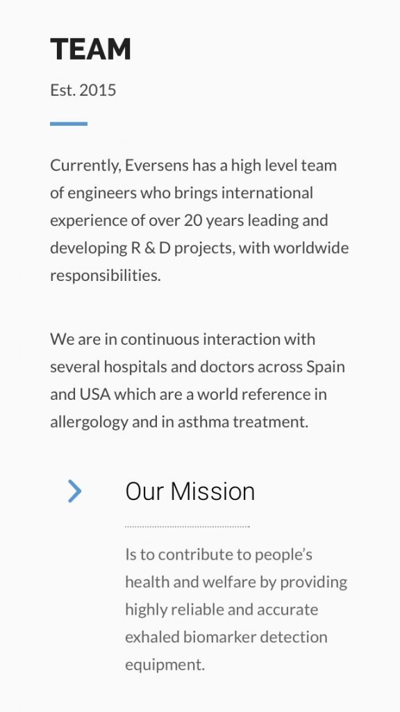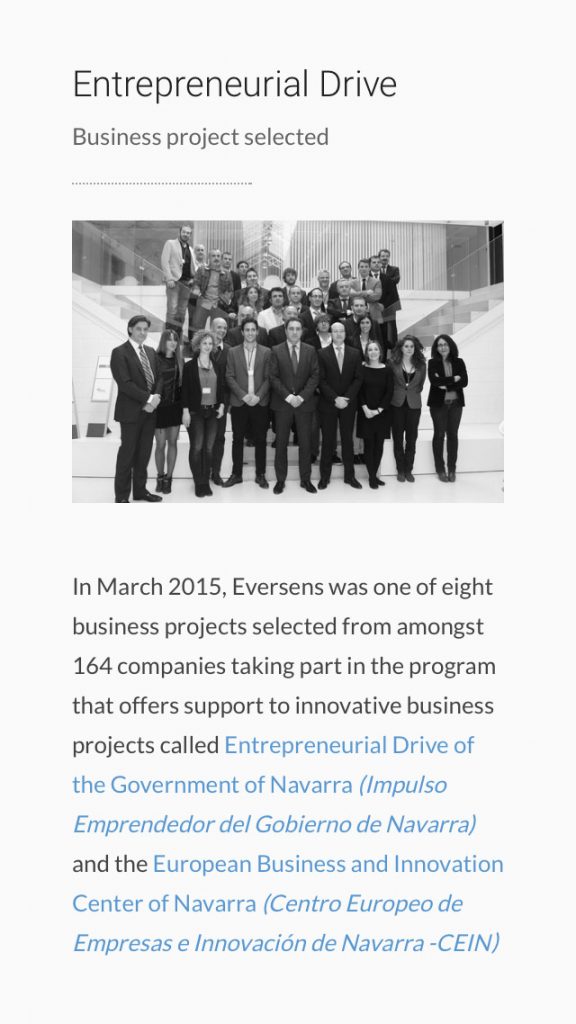 La función principal de esta página es disponer los contenidos a modo de presentación rápida sirviendo como una primera introducción corporativa de Eversens y de su producto. El proyecto viene avalado por el Centro Europeo de Innovación de Navarra y tiene una aplicación médica.